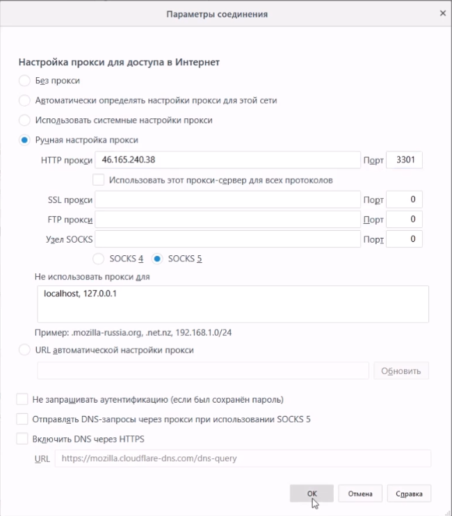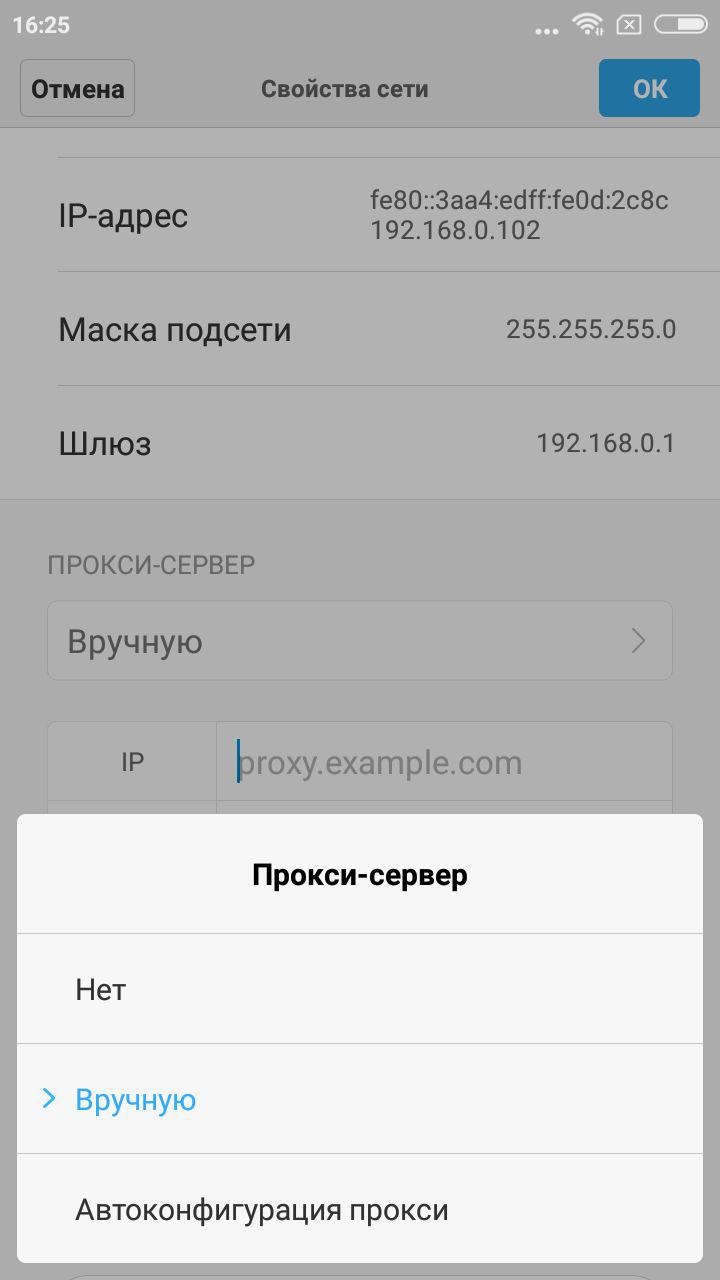 После открытия параметром соединения, выбрать пункт «Ручная настройка прокси» и в строке «HTTP прокси» прописать полученные настройки в HTTP Proxy (IP и Port), после нажать ОК.